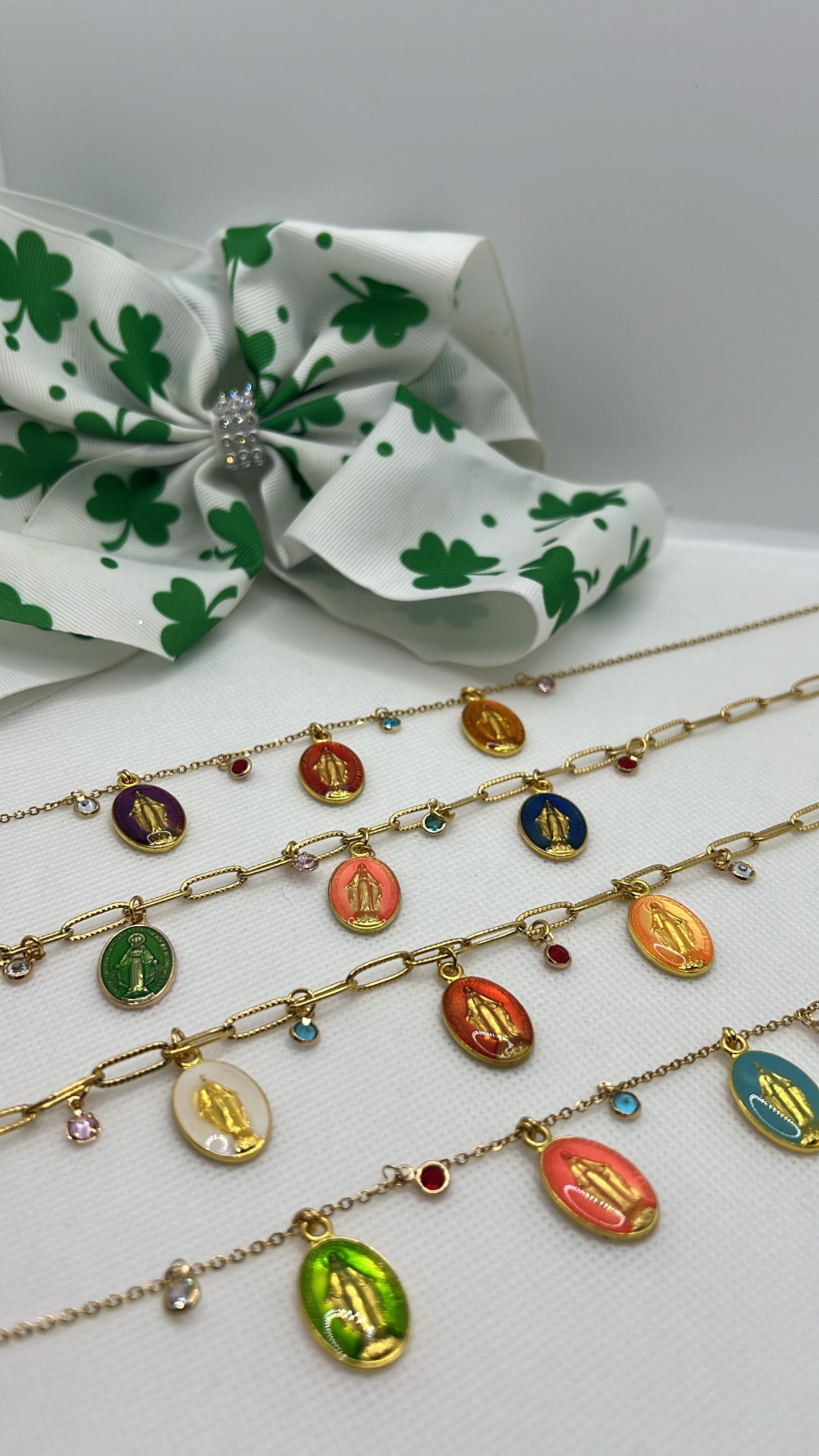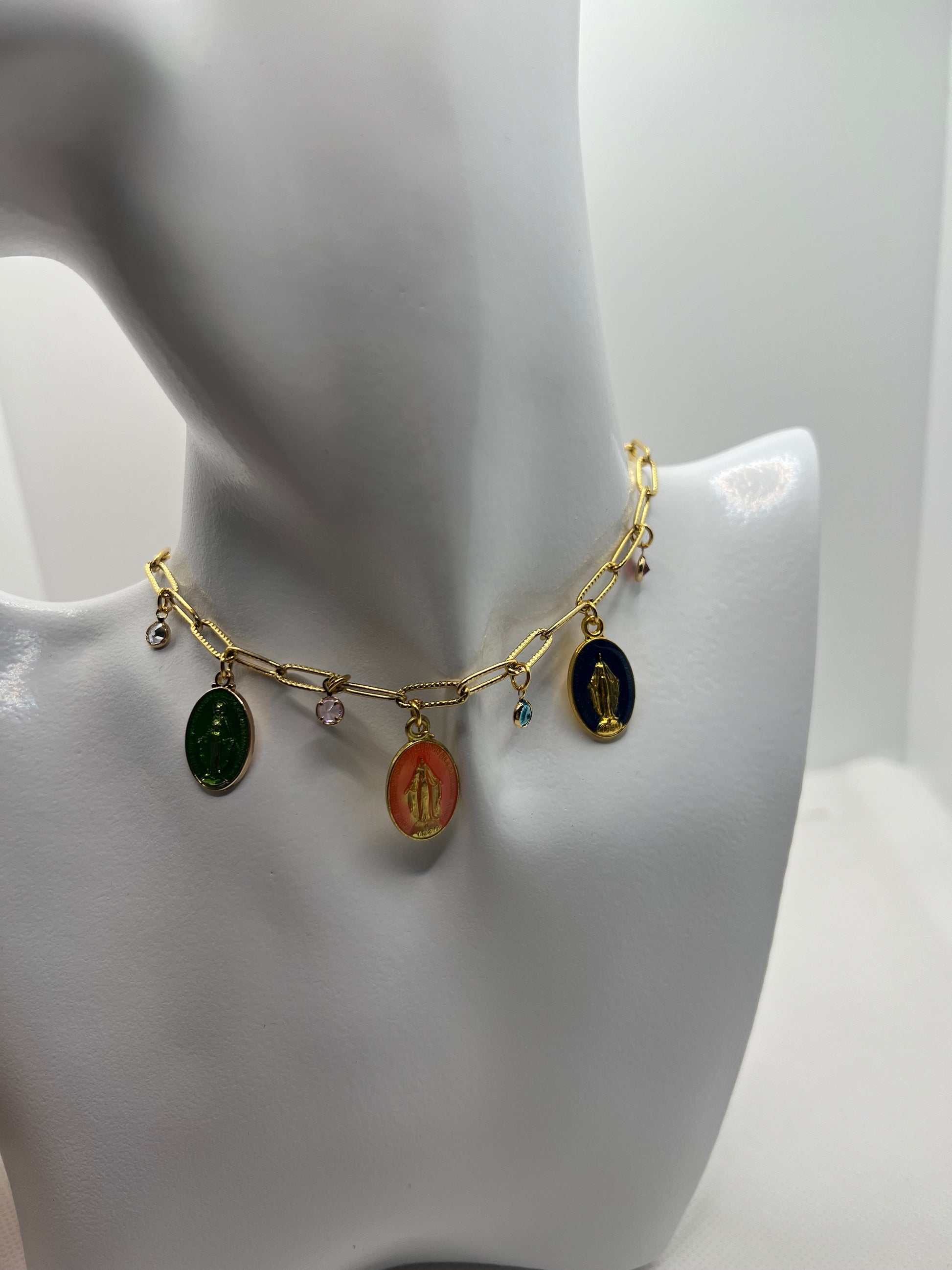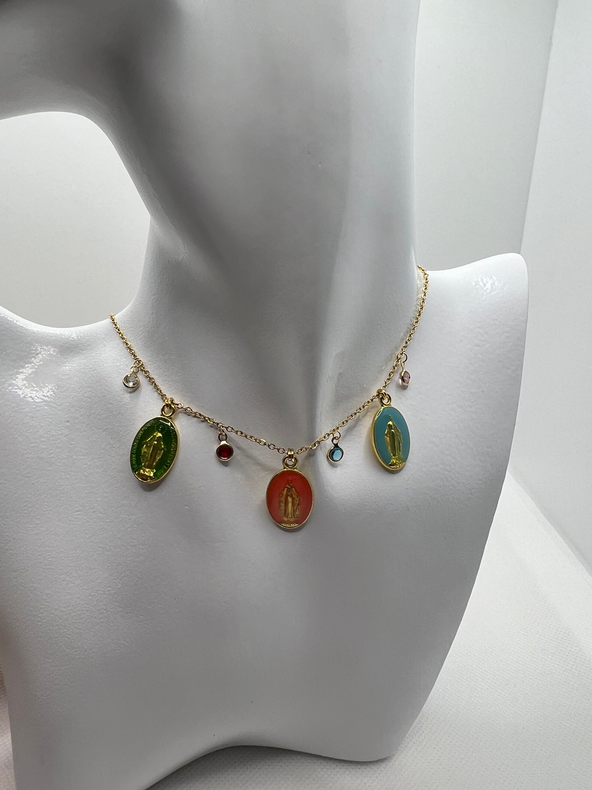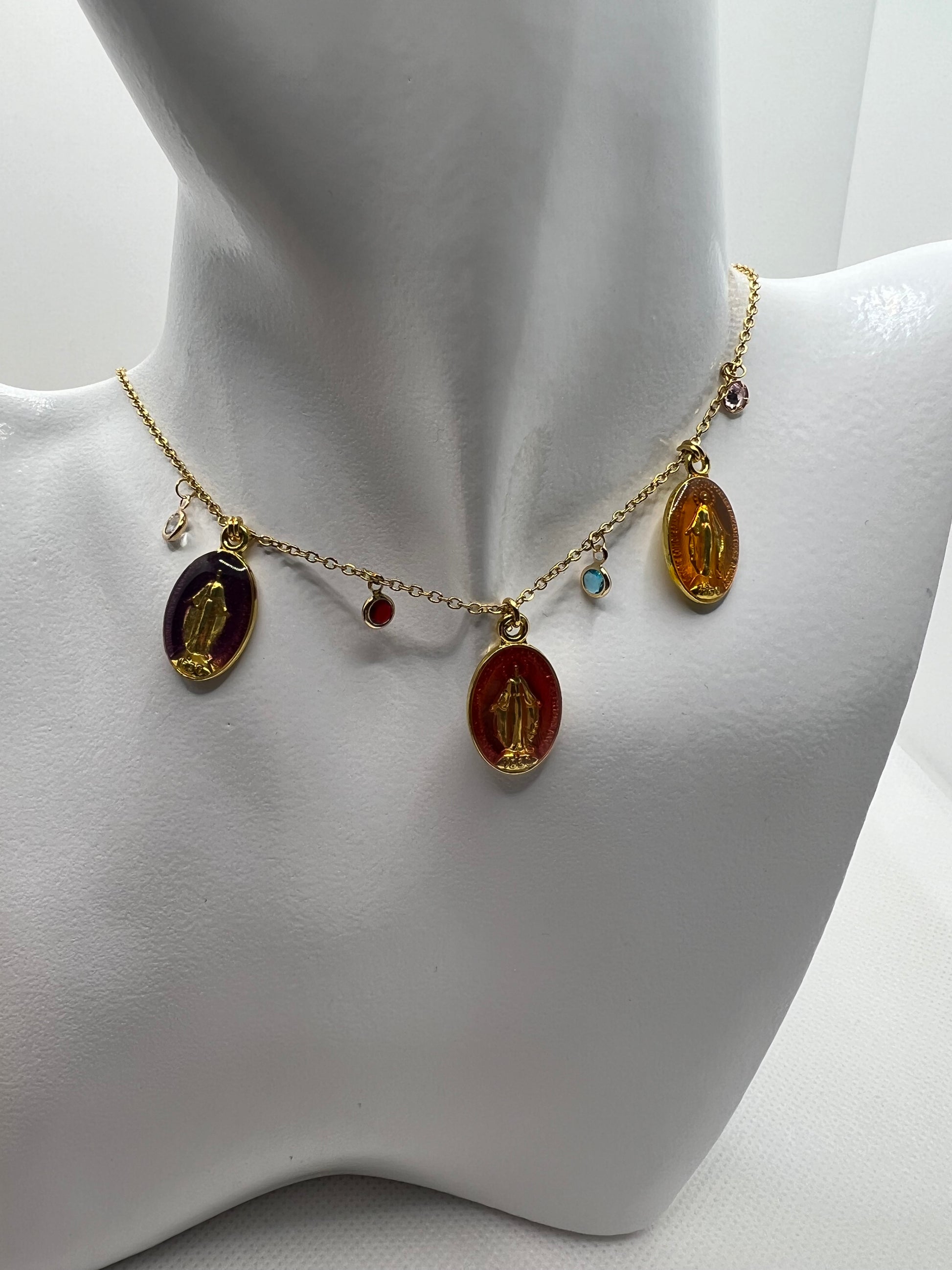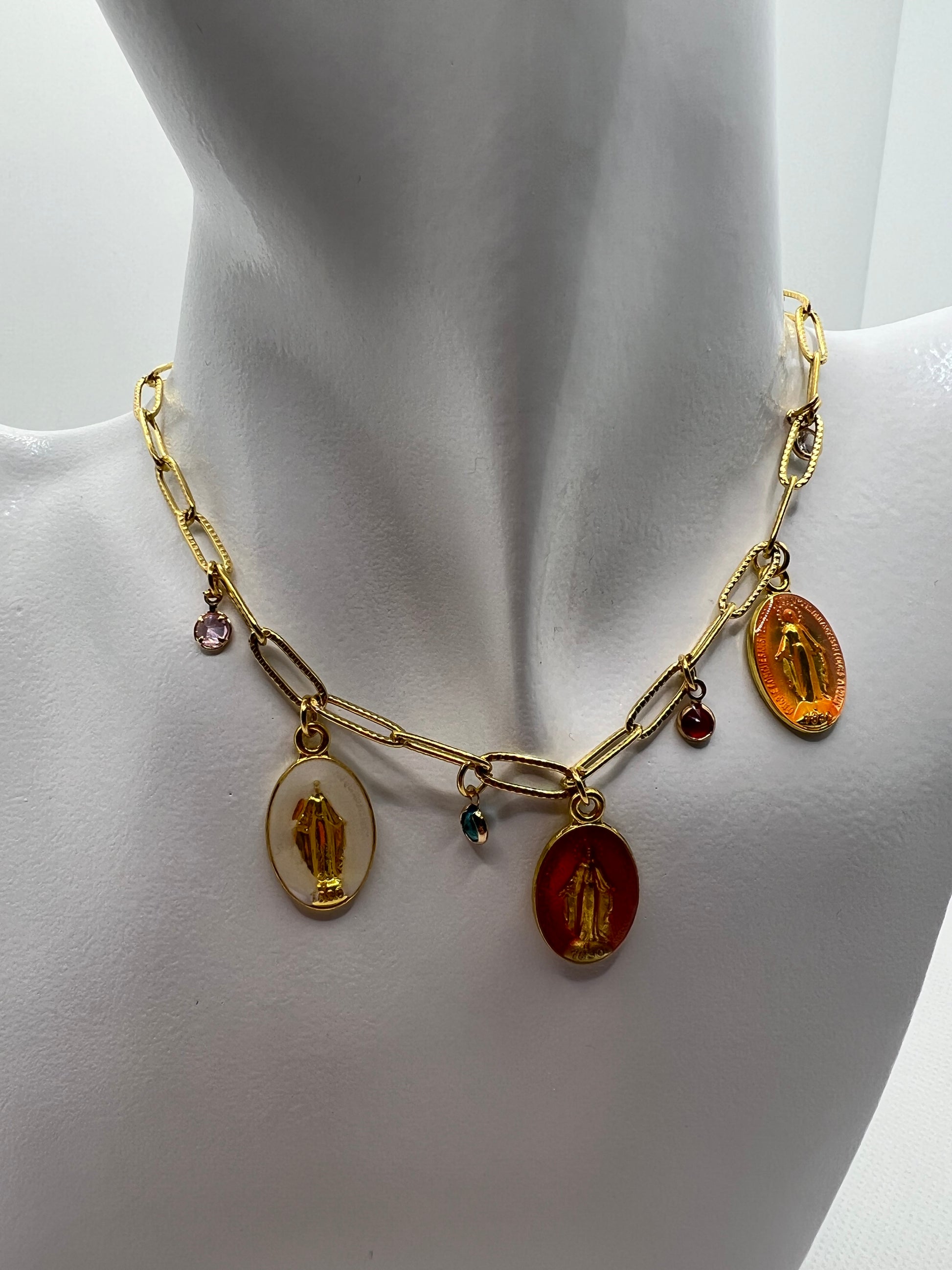 These miraculous charm necklaces are designed and hand crafted by a jewellery designer in Marbella. They feature a Blessed Virgin Mary apparition with jewell embellishments and can be fully customised to your desired length.